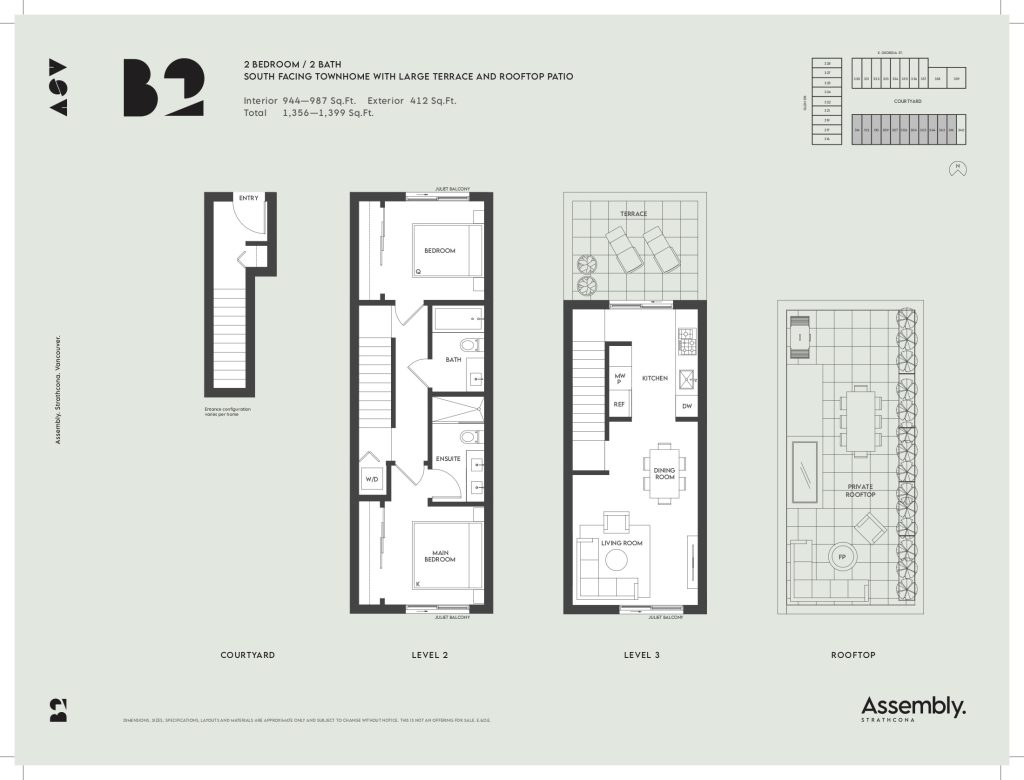 Brand New Townhome at Assembly, 2 BED + 2 Bath+ ROOFTOP DECK with STUNNING MOUNTAIN & CITY VIEWS! This home features 1400 sqft of modern living and 988 sqft indoor and 412 sqft outdoor. The main floor features a gourmet kitchen with custom cabinetry, premium Italian integrated appliances and sleek counters, modern living room with juliette balcony. This home features a reverse plan with 2 bedrooms and 2 bathrooms and a living room on the top floor and a massive rooftop deck with amazing city, mountain & water views with gas hookup. AIR-CONDITIONING. 1 parking and 2 LOCKER STORAGE. Call for your private appointment today