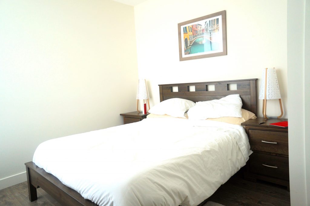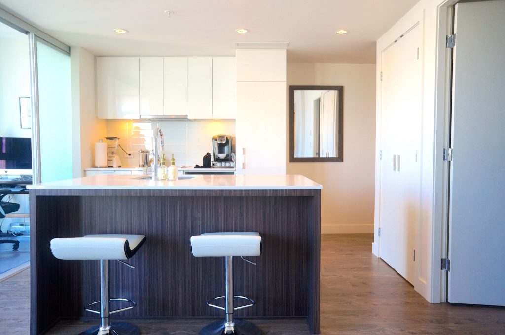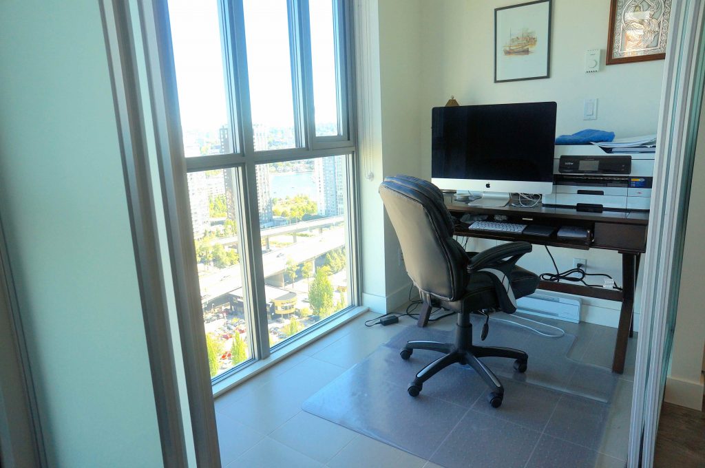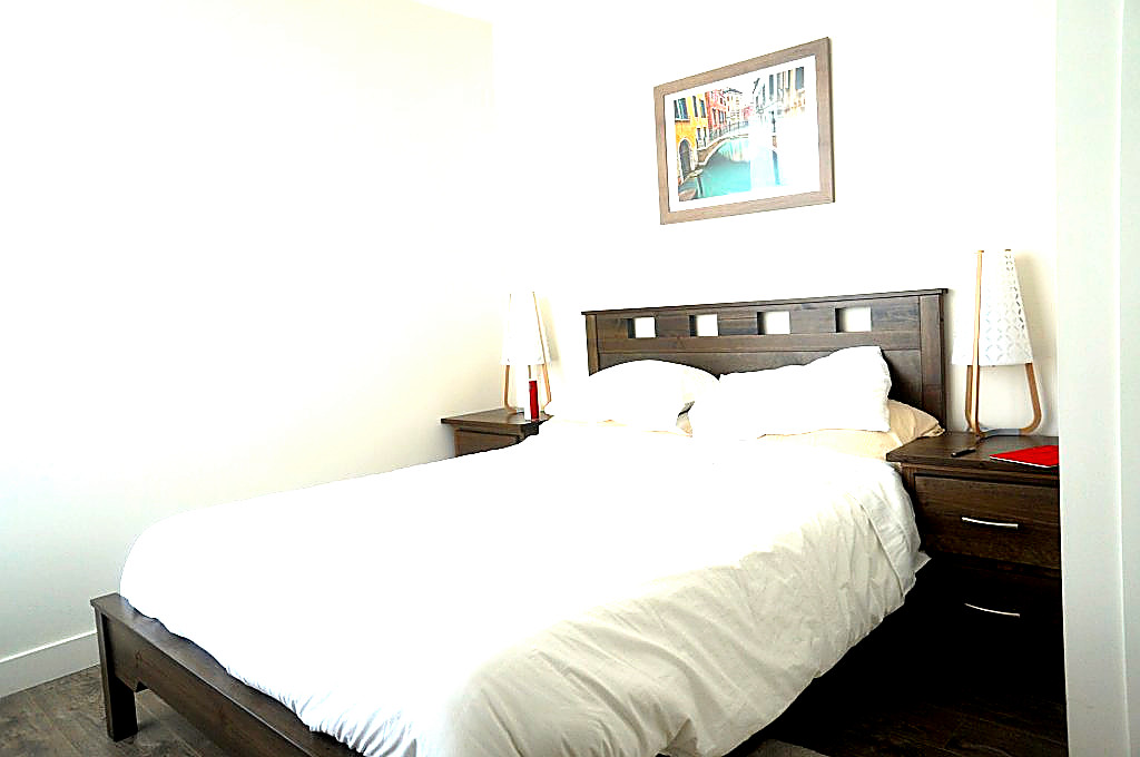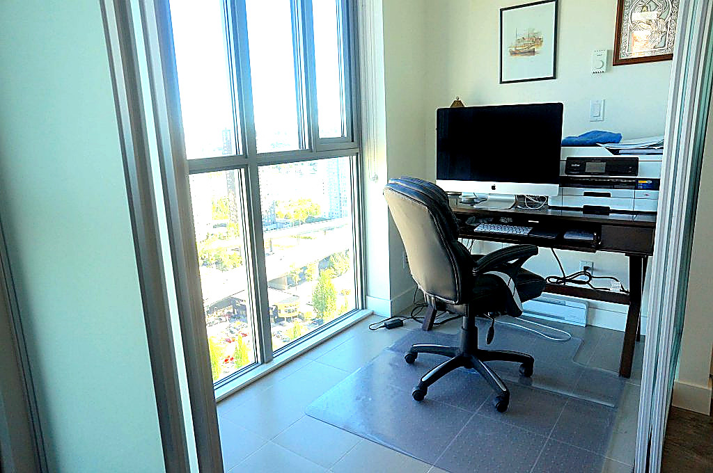 This unit features an interior that is uniquely urban—clean and uncluttered. A solid core door with polished chrome and Colombo locks from Italy. The living room, dining room, kitchen and bedroom feature laminated wood grain flooring, while glazed porcelain floor tiles protect the bathroom, den and laundry area. For privacy, there are contemporary roller blinds in the windows, and sliding dividers with frosted glass in the den and master bedroom. The kitchen showcases contemporary cabinets, recessed puck lighting, and Caesar Stone countertops in quartz with a glass tile backsplash, under-mounted stainless steel sink with polished chrome gooseneck faucet, and contemporary, under-cabinet recessed puck lighting. The appliances--an integrated fridge and dishwasher, stainless steel microwave and range hood fan, a Ceramic glass electric cooktop and a built-in wall oven—are from AEG, Bloomberg and Fisher Paykel, which make this suite a winner.
